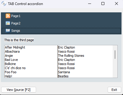 The image shows the final result with the ACCORDION style set on TAB-CONTROL. You can see the full sample program in %ISCOBOL%/sample/issamples under GUI controls, TAB-CONTROL, Accordian