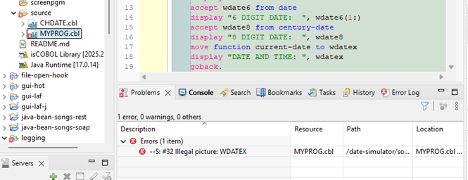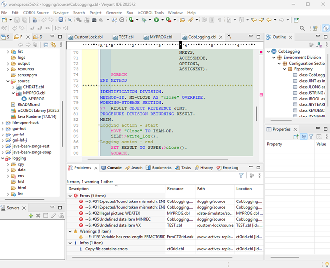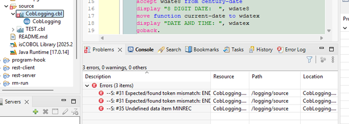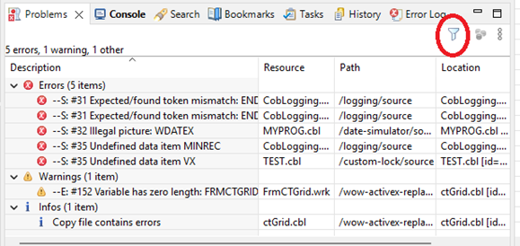 Now, when you click on different program source code files in your project, only the errors for that item will display in the problems window. For instance, when selection is on CobLogging.cbl only the errors for that program display. When the selection is MyProg.cbl, only those program errors display.