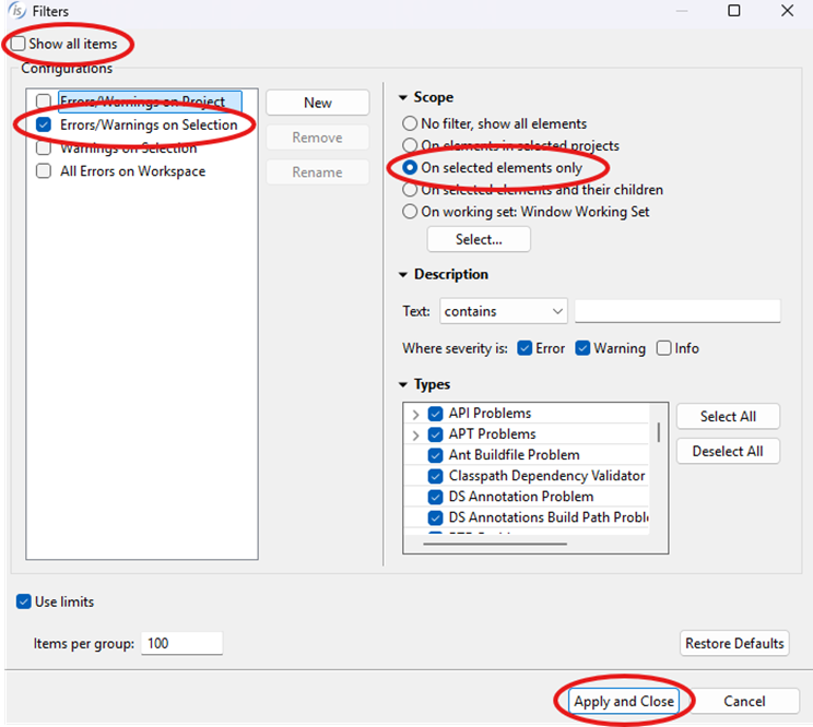 - This screen will appear. Uncheck the “Show all items” check-box in the top right corner to override the default handling. Then check the “Errors/Warnings on Selection” configuration and the “On selected elements only” scope. Apply and Close.