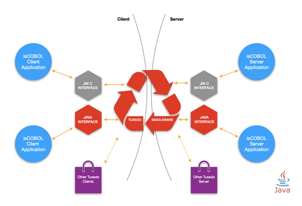 In this environment, isCOBOL interoperates with Tuxedo using the same routines used to call C programs (COBOL-calling-C routines on the client and C-calling-COBOL routines on the server) or using a pure Java approach based on