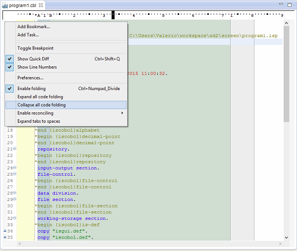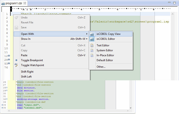 When a user decides to open a COBOL source with `isCOBOL Copy View’ it creates a new view of the COBOL source that will be opened, where all copy files are included using a different background color as depicted in the picture below, new isCOBOL View including all copy files.