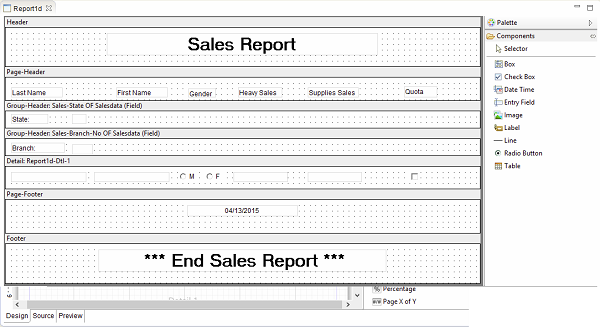 isCOBOL IDE 2015 R1 introduces a new feature to be able to generate brand new reports. In addition, you are now able to import AcuBench reports. Once AcuBench report is imported, isCOBOL IDE users can continue maintaining the reports using a WYSIWYG graphical design window where you can drag and drop report components from a graphical palette.As shown in the picture below, once components are dragged into the report, you can use the Property window to configure the appearance and behavior of the element and the Event Editor to tie the code to the element.