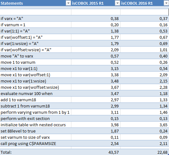 Many COBOL statements have been optimized in order to increase execution of batch COBOL programs. To take advantage of most performance improvements, the COBOL source code should be recompiled with isCOBOL compiler 2016R1.