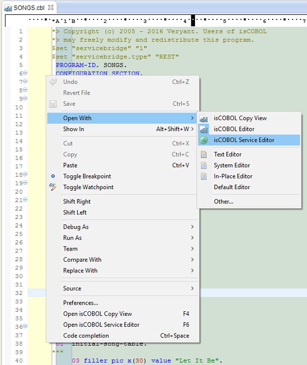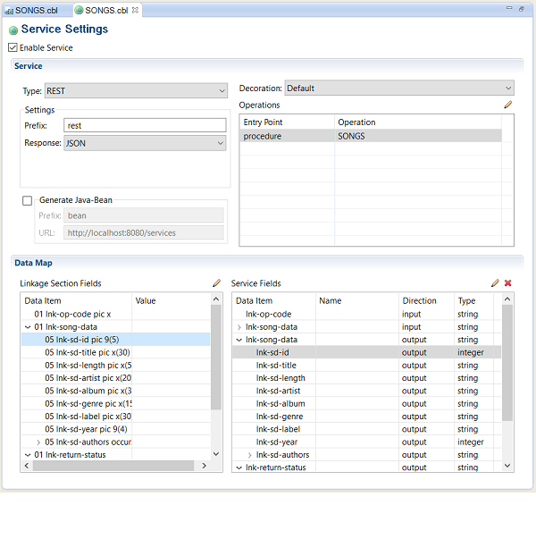 isCOBOL IDE users can rely on the isCOBOL Service Editor to automatically and graphically generate the needed configuration and directives. Using this editor, developers can map the Linkage Section data items to the Web Service parameters, as well as configure other Web Service specific parameters. As soon as changes are saved, the configuration and original source code is updated with the proper compiler directives. In the isCOBOL Editor you can access the new isCOBOL Service Editor, and graphically customize the Web Service generation.