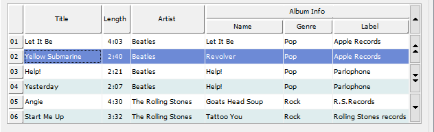 In the figure below, the SPAN CELLS feature is used to vertically span the first 4 columns and to horizontally span the Album Info cell, using the following code: