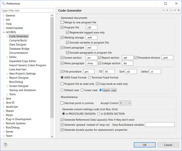 Additional options on code generation have been introduced, to allow excluding automatically generated variables or paragraph, if they are already defined in the source code manually maintained outside the tagged areas. File extensions in the file procedure sections can now be customized, and code can be generated in upper or lower case.