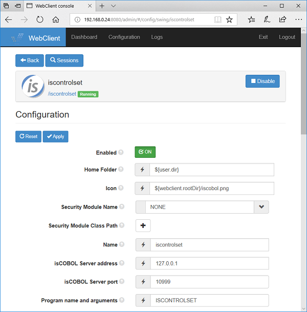 • Administration web console to configure users, isCOBOL programs and their settings, as shown in Figure 1, Configuration page.