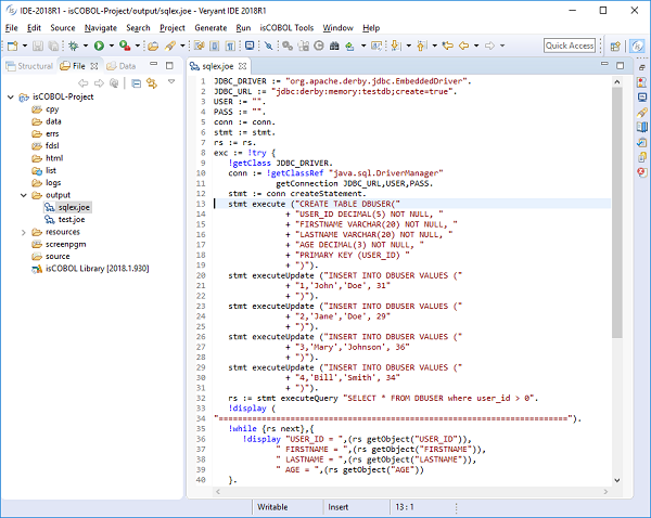 In Figure 7, JOE JDBC Example, shows a more complex script that creates a JDBC connection to a JDBC database and runs basic SQL statements. This example can be executed without any compilation. A new isCOBOL IDE plugin is provided to simplify JOE scripts coding.