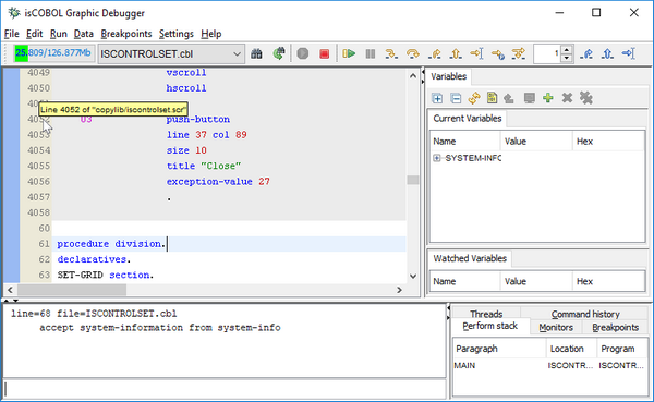 In large programs with many copybook files, sometimes it’s difficult to determine which file contains the source code being debugged. With the new debugger, a hint will appear when hovering the mouse pointer over the line number column, located on the left pane of the Debugger window, displaying the file path and line number of the highlighted line. Figure 9, Debugger hint on line column, shows the feature in action.