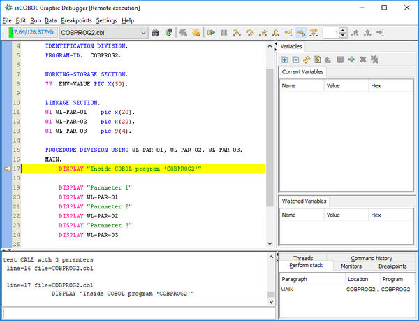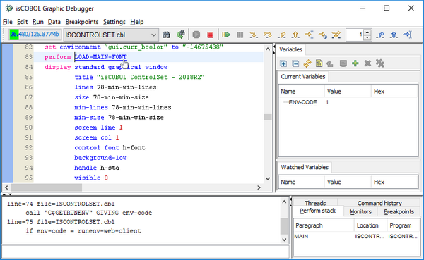 The isCOBOL Debugger has been enhanced with the new feature “Run to next program”, using the command PROG. When the PROG command is used, the Debugger continues execution of the current program, stopping at the beginning of the next COBOL program. This is especially useful when the caller program is not a COBOL program, such as a Java or C program, allowing the debugger to stop at the first COBOL program called.