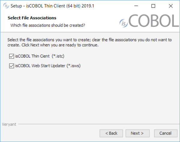 These file suffix registrations, done from the isCOBOL installation setup screen, will simplify the execution and the automatic update for the end user. The registered files contain all the isCOBOL properties needed to set up the desired execution of isCOBOL THIN and isUPDATER technologies on the client side.