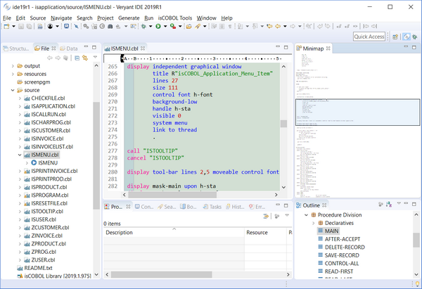The newest release of isCOBOL IDE encompasses all the new features in Eclipse 2018-09 and all new features in Eclipse Photon. One of those new features is the Editor Minimap, which gives developers a high-level overview of the content of the currently active text editor. This aids in navigation and gives you a better understanding of your code, as shown in the picture below.