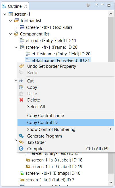 The Outline view in screen painter has been enhanced to show the controls’ ID, and the context menu of the control now has “Copy Control name” and “Copy Control ID” options to copy names and IDs to the system clipboard.
