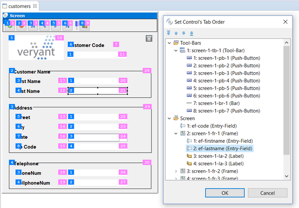 The isCOBOL screen painter can now display tabulation order and control IDs of controls, as shown in the picture below. The tab order of controls is displayed on the left side, while control ID is displayed on the right side of the control.