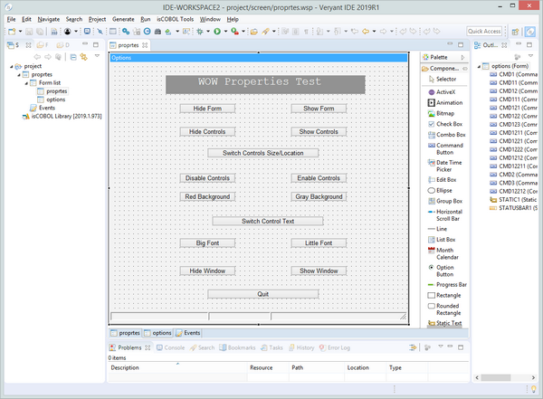 All of COBOL-WOW GUI widgets are supported and written in Java for 100% portability across environments, with an updated and modern look. isCOBOL IDE support for COBOL-WOW provides the following UI widget: Command Button, Check Box, Option Button, Static Test, List Box, Combo Box, Vertical, Scroll, Horizontal Scroll, Toolbar, Timer, Month Calendar, Rounded Rectangle, Eclipse Edit Box, Group Box, Bitmap, Animation Control, Progress Bar, Track Bar, Status Bar, Up/Down Control, Tab Control, Data Time Picker, Line, Rectangle.
