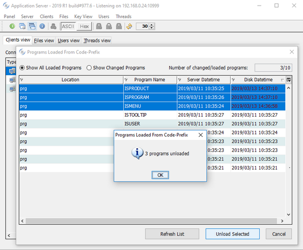 As depicted in the picture below, the isCOBOL Server Panel now provides a “Programs Loaded From Code-Prefix” dialog that shows programs loaded under iscobol.code_prefix, the timestamp of the loaded programs and of corresponding disk class file, and allows unloading of selected COBOL programs without restarting the application server. This feature allows developers to provide new versions of COBOL programs to be loaded to isCOBOL Server’s users for immediate use.