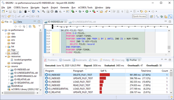 The Profiler feature can now be executed from the isCOBOL 2020 R2 IDE, and a specific View is provided to show and analyze the results of the profiling process.