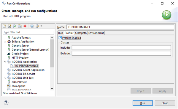 Figure 6, isCOBOL Profiler in isCOBOL IDE shows how to enable profiling on specific programs. By default, all programs are included in Profiler, and the results gathered by the analysis are available in the Profiler View, as shown in Figure 7, isCOBOL Profiler View.