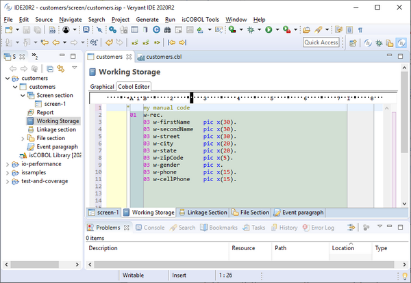 The isCOBOL IDE’s Screen Painter now supports manual editing in Working Storage, Linkage Section and FD sections, to complement the Graphical editor previously available.