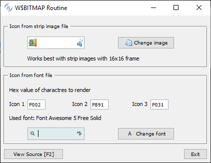 The following code snippet loads a font using the W$FONT routine, then it loads the glyph symbols of 3 characters identified by their Unicode numbers. Using the new op-code, the W$BITMAP routine can be called passing the font handle, the list of characters, the font-size and color to be used. The routine will generate a bitmap strip that can be used in controls that can handle bitmaps strips,