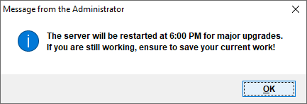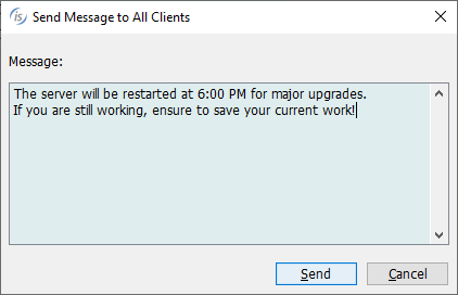 In Figure 23, Clients menu, the Administrator is choosing to Send a message to all clients, and in Figure 24, Send message window, the text has been input. After pressing the button Send, the message will be delivered to connected ThinClients and WebClients, advising users of downtime due to maintenance. Figure 25, Message received from ThinClient, shows the message received on the ThinClient processes.
