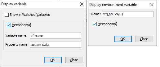 as well as the graphical debugger window, as shown in Figure 27, Debugger display windows, in “Display variable” and “Display environment variable”, checking the “Hexadecimal” box.