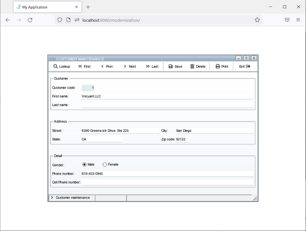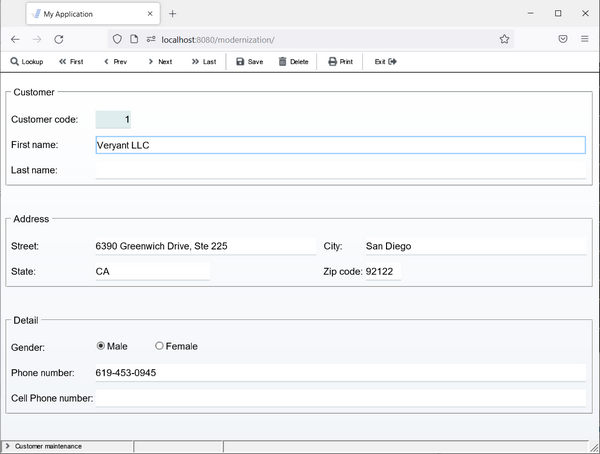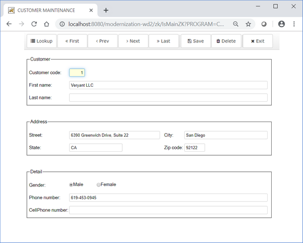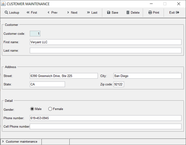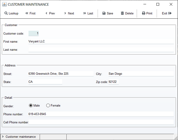 01 S1. 03 label title "Customer code:" line 3 col 2. 03 entry-field numeric value cust-code col + 2. 03 label title "First name: " line 4 col 2. 03 entry-field value Cust-First-Name col + 2. 03 label title "Last name:" line 5 col 2. 03 entry-field value Cust-last-Name col + 2. 03 label title "Address:" line 7 col 2. 03 label title "Street:" line 8 col 2. 03 entry-field value Cust-Street col + 2. 03 label title "City:" col 50. 03 entry-field value Cust-City col + 2. 03 label title " State:" line 9 col 2. 03 entry-field value Cust-State col + 2. 03 label title "Zip code:" col 50. 03 entry-field value Cust-Zip col + 2. 03 label title "Gender:" line 11 col 2. 03 entry-field value Cust-Gender col + 2. 03 label title "Phone number:" line 13 col 2. 03 entry-field value Cust-Phone col + 2. 03 label title "Cell Phone number:" line 14 col 2. 03 entry-field value Cust-CellPhone col + 2. 01 s-func. 03 push-button exception-value 1 self-act title "F1=Lookup" line 17 col 2 size 9. |