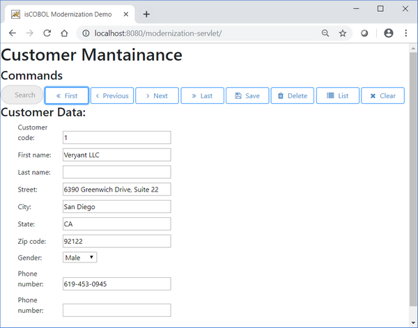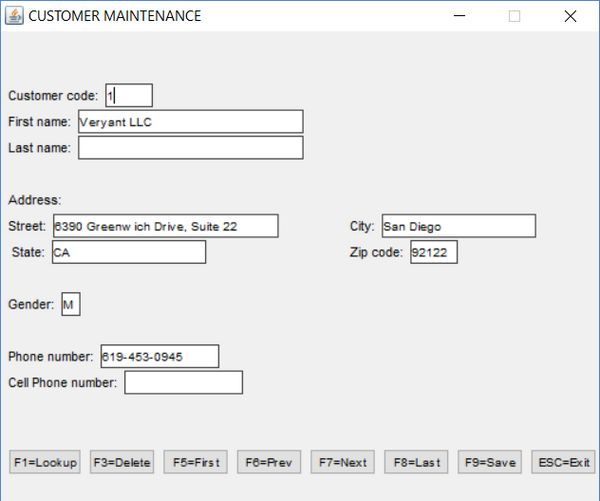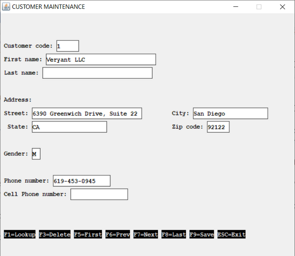 01 s1. 03 "Customer code:" line 3 col 2. 03 using cust-code col + 2 high prompt. 03 "First name: " line 4 col 2. 03 using Cust-First-Name col + 2 high prompt. 03 "Last name:" line 5 col 2. 03 using Cust-Last-Name col + 2 high prompt. 03 "Address:" line 7 col 2. 03 "Street:" line 8 col 2. 03 using Cust-Street col + 2 high prompt. 03 "City:" col 50. 03 using Cust-City col + 2 high prompt. 03 " State:" line 9 col 2. 03 using Cust-State col + 2 high prompt. 03 "Zip code:" col 50. 03 using Cust-Zip col + 2 high prompt. 03 "Gender:" line 11 col 2. 03 using Cust-Gender col + 2 high prompt. 03 "Phone number: " line 13 col 2. 03 using Cust-Phone col + 2 high prompt. 03 "Cell Phone number:" line 14 col 2. 03 using Cust-CellPhone col + 2 high prompt. 01 s-func. 03 "F1=Lookup" line 23 col 2 reverse. 03 "F3=Delete" col + 2 reverse. 03 "F5=First" col + 2 reverse. 03 "F6=Prev" col + 2 reverse. 03 "F7=Next" col + 2 reverse. 03 "F8=Last" col + 2 reverse. 03 "F9=Save" col + 2 reverse. 03 "ESC=Exit" col + 2 reverse. |