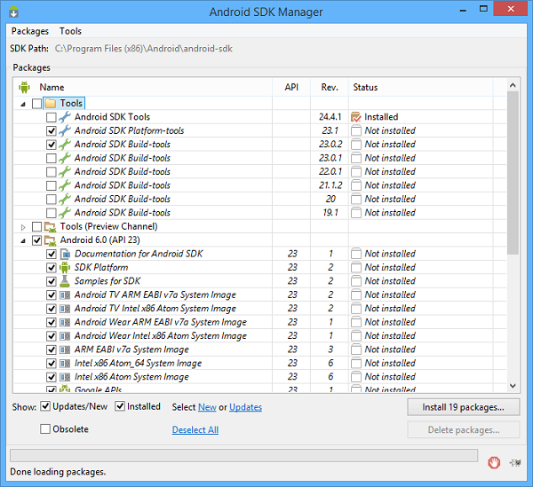 By default the SDK Manager allows to install the latest platform tools, system image and USB driver, but you can install also previous versions as well as additional resources. Mark the items that you wish to install, then click on the Install packages... button.