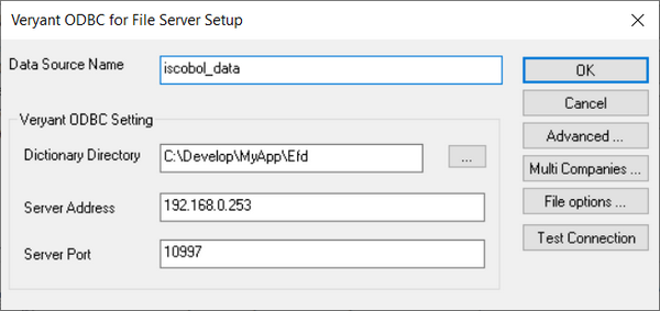 • Server Port is the port of the machine where the isCOBOL File Server is active and listening. If omitted, then 10997 is assumed.
