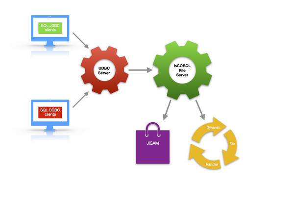The UDBC Server receives connections from SQL clients and provides them with access to COBOL files through the isCOBOL File Server. See